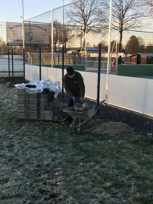 Von insgesamt 32 ehrenamtlich unterstützenden Sportkameraden der TuS-Fußballer wurden in insgesamt 59 erfassten Arbeitseinsätzen 908 Arbeitsstunden unentgeltlich eingebracht. Zusätzlich zu den vom Bauhof nutzbaren Gerätschaften kam noch der von den Sportfreunden Tono Isfort, Tim Hellenkamp und Bernhard Webers unentgeltlich bereitgestellte Maschinenpark (Trecker, Anhänger, Teleskoplader, Radlader, …), ohne dem die umfangreichen „Erdbewegungen“ nicht denkbar gewesen wären.